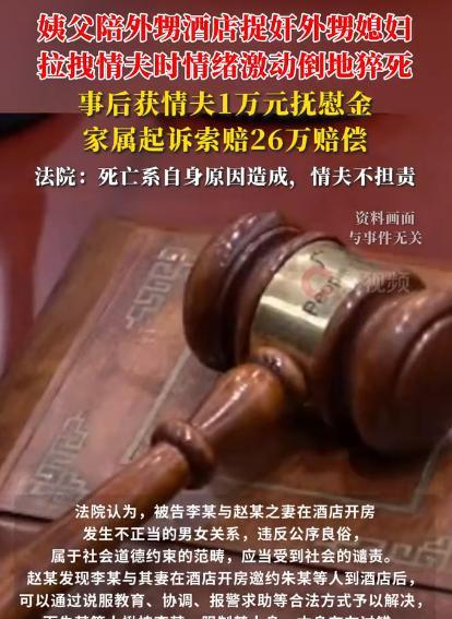 [微风]湖北,得知外甥媳妇出轨,一大爷遂陪同外甥一起到酒店捉奸,上楼时恰巧碰见从房间出来的外甥媳妇的情夫。大爷当即上前拽住外甥媳妇的情夫,与外甥媳妇的情夫发生拉扯、争吵!谁料,过程中,大爷情绪激动突然倒地,经抢救无效死亡。事后,虽然外甥媳妇的情夫给了大爷的家人1万元抚恤金,但是大爷的家人难以释怀,又将外甥媳妇的情夫告上法庭,索赔26万余元损失。 事情发生在2024年12月14日那天早上,在湖北某酒店。 赵某这几天总觉得妻子不太对劲,妻子总是不着家,还经常骂着他出门,两人经常因为这吵架,妻子说不想吵架,都冷静冷静。 于是赵某的妻子找了一家酒店住,丈夫不放心,怕妻子路上出事,就一路跟着妻子。 看到妻子办好入住才放心,本来想着是自己媳妇,道个歉也没什么,总不能一直花钱住酒店吧。 赵某给酒店工作人员说明情况,想上楼看一眼妻子,还给工作人员证明了两人的夫妻关系。 酒店工作人员同意了,但也给赵先生提了个醒,如果您的妻子不愿意您进去,就请离开。 赵某答应了,刚到妻子的房门口,他就觉得不对劲,隐隐听到妻子房间里传出陌生男人的声音。 这一下子把他气得不轻,但他没有报警,而是第一时间打电话叫来了他舅舅朱大爷帮忙。 朱大爷听完电话,只回了一句:“你别慌,我马上到。” 同时,赵某的小姨也接到消息赶了过来。 三人在酒店大堂碰了头,也没多说几句,决定直接冲上去看看。 结果电梯门一开,还真让他们撞上了一个陌生男子正好从赵某妻子的房间里走出来,那人就是李某。 朱大爷一看,火气“蹭”地一下就上来了,冲上去一把揪住李某的衣领,骂道:“你干的好事啊!” 他们想把李某强行留下来,李某当然不愿意就这么被一堆人围住,他想脱身。 这时赵某的小姨也来拦,几个人在走廊里打成一团,场面一下子非常混乱。 争执大概持续了五分钟左右,谁也没想到,意外突然发生了,朱大爷脸色一变,身子一软,直接倒在了地上,还开始抽搐。 这时候亲戚们都怕李某趁乱跑了,就怎么注意朱大爷的情况。 但这时候不是亲戚们反应快,而是那个被围住的李某反应最快。 李某一边喊赵某快打120,一边冲赵某小姨吼让她松手,还自己立刻报警,并检查朱大爷是否还有脉搏。 等警察和急救人员赶到时,朱大爷已经没了生命体征,医生判断是心脏骤停。 一个活蹦乱跳的人,说没就没了。 朱大爷的家属怎么也接受不了,他们觉得就是李某的婚外情害死了人,要是他不跟赵某老婆搞事情,哪会有这出? 朱大爷也不会气得发病。 再加上酒店方面当时没有及时劝阻和干预,也被家属一起拉出来指责。 李某和酒店一开始都觉得自己冤,说老人的死归根到底是因为他本身身体有问题,跟他们扯不上太多关系。 但派出所出面调解后,李某和酒店还是各拿出1万元,做个表态。 可这点钱朱大爷的家属根本不愿意。 最后,朱大爷家人把李某告上了法庭,索赔26万多块钱。 法院给的结论是:李某不符合承担侵权责任的全部条件,朱大爷家属的起诉请求,法院全部驳回。 这个判决一出来,不少人都觉得心寒:一个搞婚外情的,结果啥责任都不用负,好像挺没天理的。 朱大爷人没了,亲属痛失亲人,官司也没赢。 李某虽然躲过了赔偿,却也落下了满身骂名,大家都为这场冲动付出了代价。 这事提醒我们一个道理:再气也得冷静。 冲动解决不了问题,反而可能让事情变得更糟。 信源:潇湘晨报·晨视频