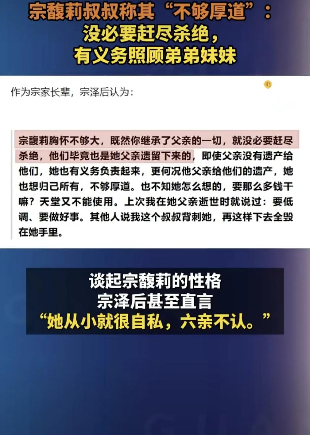 宗馥莉的亲叔叔宗泽后这样指责自己的亲侄女,真有点看不懂? 宗泽后用天下最难听的话指责宗馥莉这个侄女,是不是在侄女面前没捞到什么好处,联合“小三”一家子来对宗馥莉的。 还有甚至网上传言,孩子跟这个叔叔长得有点像,这样一说好像就理解了宗泽后的做法了。 看宗泽后这种做法就不厚道,做为长辈,一般都是劝和,什么能无理的指责一方呢?大家认为对不对?