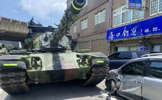 中国东南某省军事演练,坦克在街上跟汽车撞上了。 车主估计得赔死,CM-11勇虎战