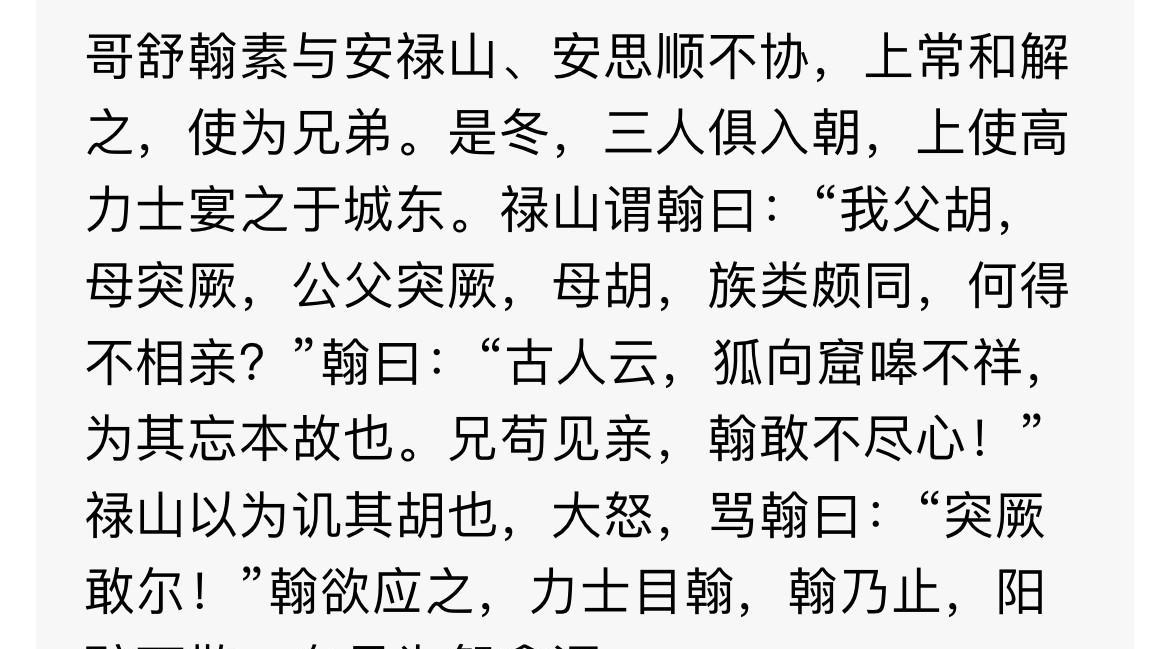 看《资治通鉴》,有一段把我逗笑了。哥舒翰和安禄山关系不好,安禄山就想修复关系,和他说咱们都是胡人,为啥不能近亲呢?哥舒翰大骂,你才是胡人呢,我是唐人! 原来,在胡人内部,也是有鄙视链的,身为突厥王族的哥舒翰,当然看不起作为杂胡的粟特人安禄山。