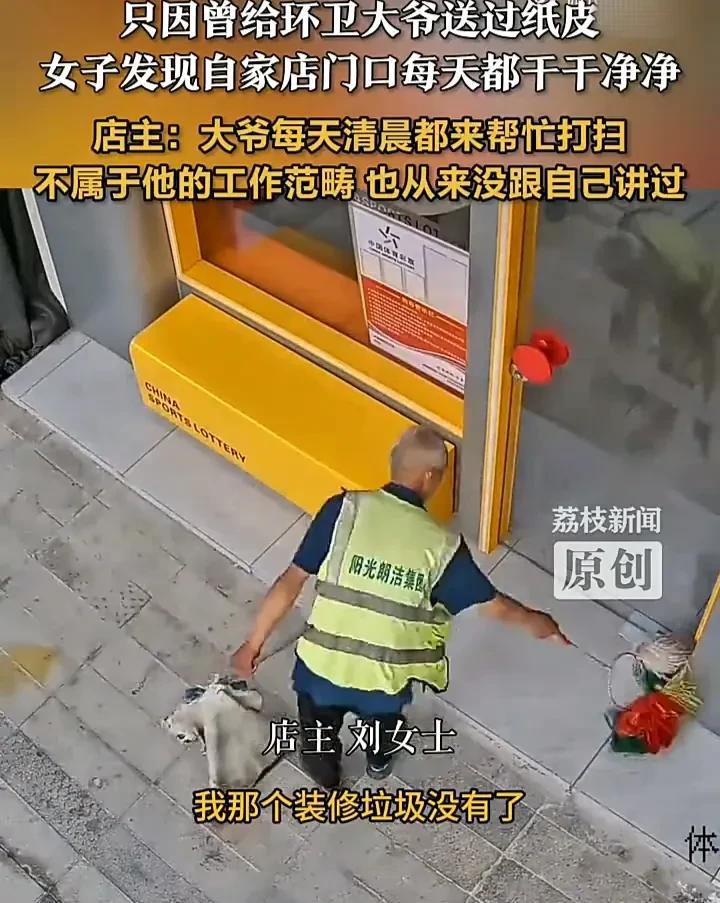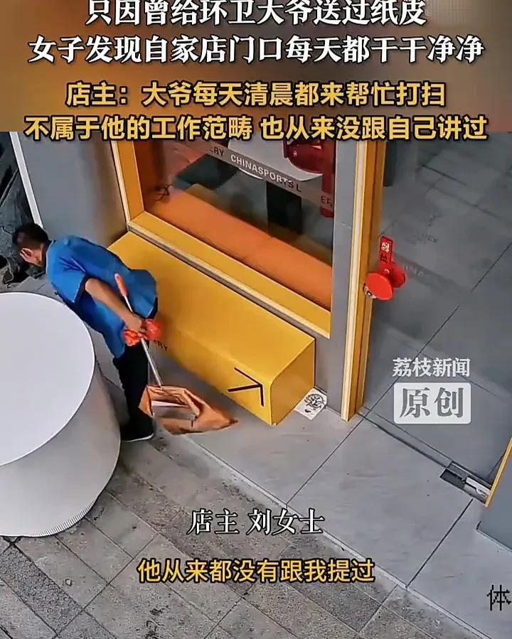 好人有好报!近日,河南信阳一名女子发视频称,自己新店装修的时候,曾把一些纸皮送给一位环卫大爷,之后发现店门口每天都是干干净净的,刚开始自己还以为是物业清扫的,后来查询监控才知道,是那位大爷每天都帮忙打扫。