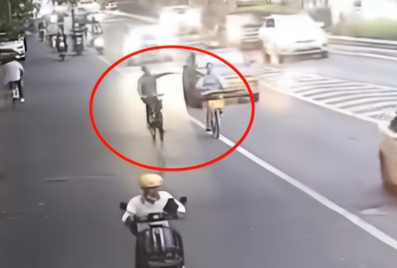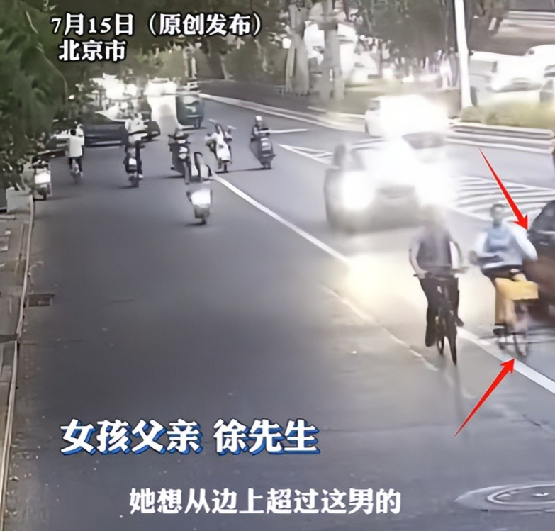 02 真想浮出水面 那么,具体为啥会并排骑行? 女孩父亲徐爸爸是这样说的: “我女儿骑着共享单车,只是想从后面超过这个灰衣男,然后响了两声铃铛,结果就被他一路狂追往机动车道上挤”。 此刻,刚刚从他俩后面超过去的外卖小哥孟先生,把眼前的一幕尽收眼帘,也证实了这一点。 “我不知道具体事情是怎么发生的,但我看见的时候,这个男子就在后面别女孩的车,直接把她推向机动车道,特别危险……”