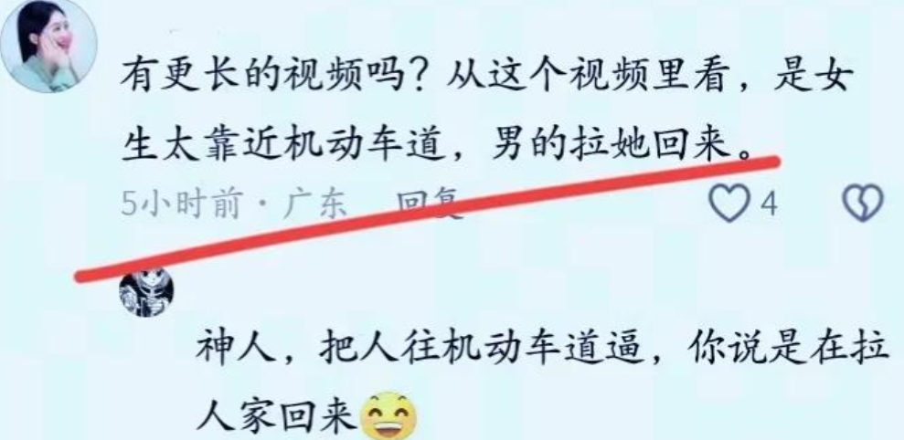 03 罗生门:是帮人还是推人? 说实话,一个14岁的孩子,一般情况上初二了,等暑假结束再开学就该上初三了,这个年龄的孩子,尤其是女孩子骑自行车一般不会太鲁莽。 或许是,灰衣男觉得女孩骑着共享单车一个人,他又被车铃铛的响声吓到了,所以,他就想惩戒一下对方。 你看,视频里他的手直接拉着人家小姑娘,往路边拉,好像是在帮女孩,但女孩也说了:“我超过他的时候,他在后面骂我。” 当事人曝光真相之后,可评论区却有不一样的声音:“这个男的不是在推人,是好心办坏事。”