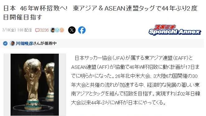 劲爆消息,中国将联合其他国家申办2046年世界杯?据日本媒体报道,东亚和东南亚将