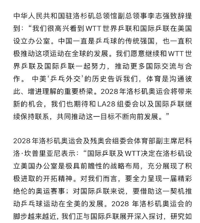 WTT世界乒联与国际乒联宣告设立美国办公室,与此同时,WTT全球训练中心以及世界乒乓球管理集团全球总部也落户于洛杉矶。
