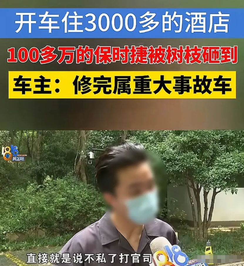 浙江杭州,男子和朋友入住3000元一晚的酒店,将自己150多万的车停在酒店指定的停车场里。万万没想到,树枝掉落,砸坏了男子的车,4s店定损10000元。可男子说:车辆修复后再卖,这车就成了重大事故车,有折损,一开始他要求酒店赔偿30000元,后面降到1万,可酒店却说:不私了,打官司。