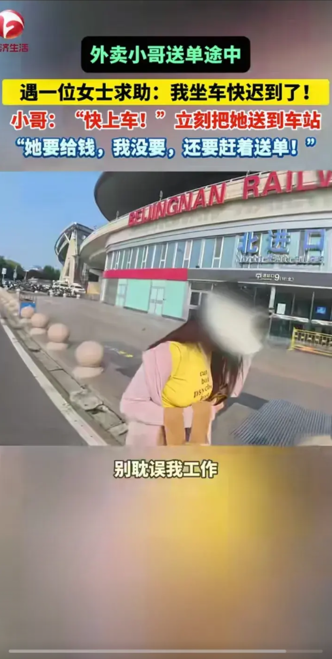 7月11日,北京。外卖小哥在送餐途中遇到黄衣女子求助,她说要去车站,因为打不到车快迟到了。 说完后,外卖小哥就送女子去车站,大概花了七八分钟。 之后,女子要给外卖小哥路费,他没要,就赶着送单去了。