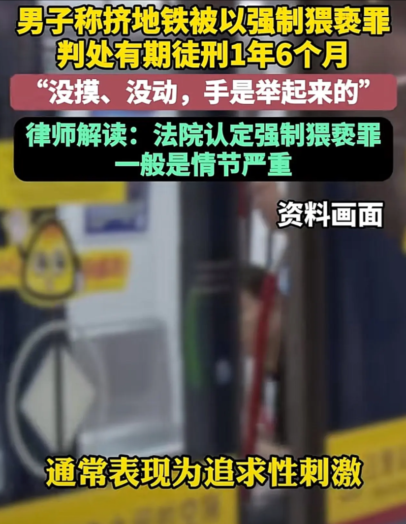 广州,男子称在挤地铁时,身体隔着包碰触到一女子身体,女子一口咬定男子对自己实施了不轨行为,并报了警。男子大喊冤枉:我没有摸、也没动,连手也是举起来的?结果,警方认定男子涉嫌强制猥亵罪,判处男子有期徒刑1年个月。
