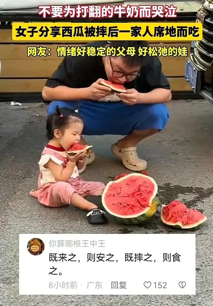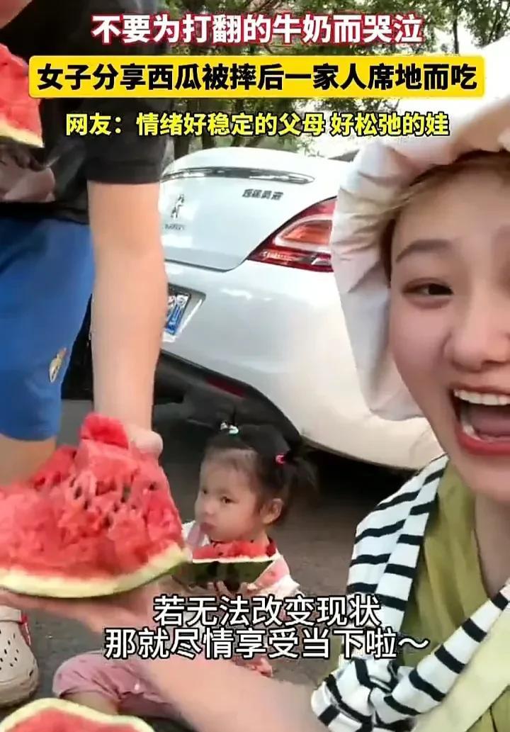 这样的家庭氛围太让人羡慕了!近日,辽宁一名女子发视频称,自己和老公带娃出门时买了一个西瓜,谁料途中不慎摔破,于是一家人就席地而坐开始吃西瓜,还免费向路人分享,想表达一句话就是“永远不要为打翻的牛奶而哭泣”。