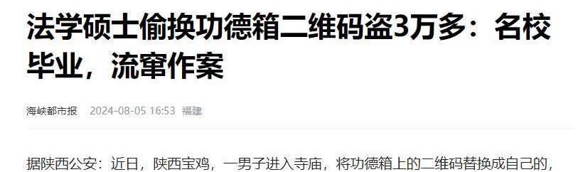 “你就说灵不灵验吧?”陕西,一年轻男子赚不到钱,就到寺庙去“许愿”,突然发现功德箱上贴着二维码,男子动了歪心思,他将自己的收款码打印下来,覆盖在原来的码上。几天后,警察找上门的时候,男子已经收入30000元了。 现在社会上,去寺庙扫码往功德箱里捐钱已经很常见了。可有个法学硕士,咱们就叫他小唐吧,他竟然打起了这个主意。 小唐是陕西人,从一所名牌大学法学硕士毕业,但因为心高气傲,一直找不到工作,钱也花光了,心里挺不是滋味。听说同学们都找到了好工作,他就怪自己“运气太差”,跑到寺庙去烧香求好运。他跪在那儿许愿,起来时看到功德箱上有个收款二维码,心想:“连佛祖都跟上时代了。”他突然有了个歪点子:如果把二维码换成自己的,那钱不就自己进账了吗?虽然他学过法律,知道这是犯法的,但还是被钱迷了心窍。 过了几天,他趁别人不注意,偷偷换了二维码,还在佛前磕头求原谅。没几天,他的微信账户里就开始不断有钱进来,从几块到上千块都有,加起来有三万多。他本想凑够五万就收手,可没等到那天。寺庙的人发现好久没收到钱了,就报了警。警察很快就通过二维码的实名制找到了小唐。被抓的时候,他还在想自己是“一时冲动”,还说本来打算收手的。但这些话都掩盖不了他偷钱的事实。 最后,小唐被警察抓起来,等着法律的惩罚。学历再高,品行不好也不行,更何况他还是知法犯法,真是让人叹息。
