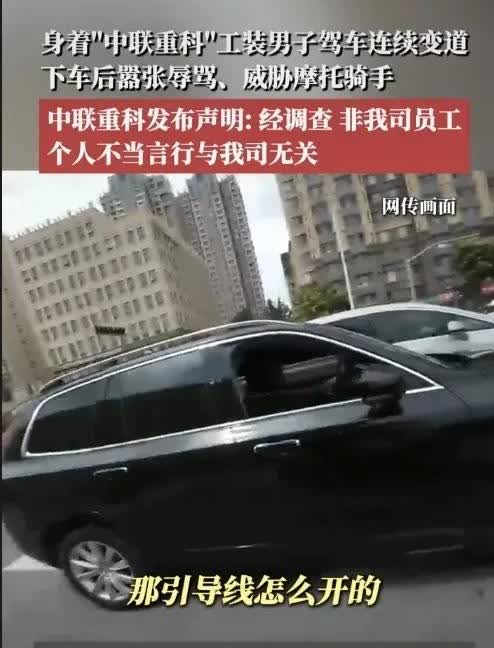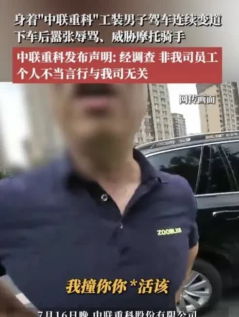 这种人自己不遵守交通规则,还影响别人,凭什么如此嚣张,霸道,就知道欺负一些老实人弱小的人,碰到强硬的,有实力的,他还敢这样吗?他如果在国外敢这样吗?极其鄙视这种人。 7月16号,一身着“中联重科”的男子随意变道,也未打转向灯,不知道怎么拿到驾照的,严重影响后面骑摩托车的;骑摩托车男子和轿车司机争论,轿车司机一脸不服气,还威胁辱骂摩托骑手。 而中联重科第一时间就是说轿车司机不是他们的员工,不关他们的事。 这人是谁啊,什么来历,为什么敢如此目中无人,嚣张跋扈,网友都建议好好查一查。 大家怎么看待这位穿着“中联重科”男子的行为呢?