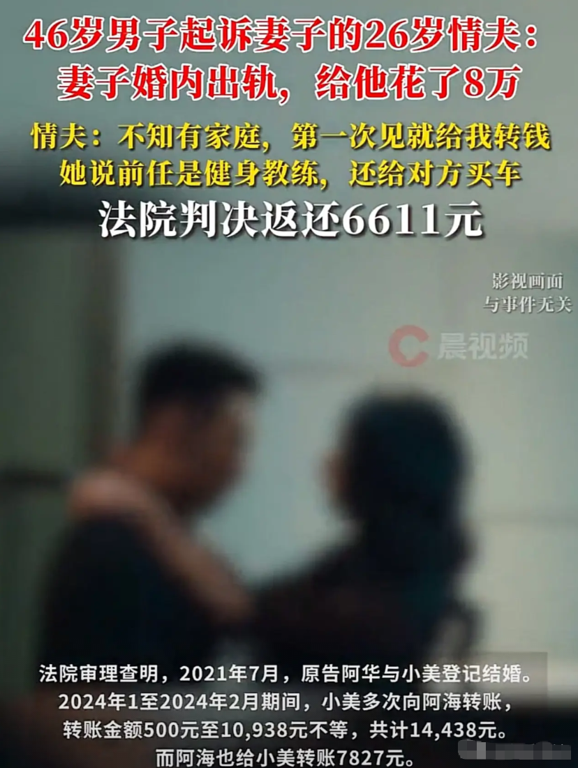 辽宁阜新,女子背着丈夫,与26岁小伙发展成情人关系,期间,对小伙出手大方,不到半年就为其花了8万元。被女子丈夫发现后,直接将小伙告上法庭?要求返还8万元,意外的是,法院判决小伙仅返还6611元。