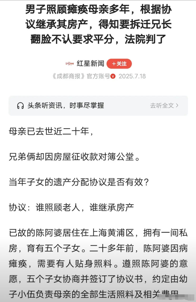 上海,男子伺候瘫痪母亲5年,母亲去世后,按协议他一人继承母亲的房子,不料,房子要拆迁,三哥跳出来要平分补偿款,其他3兄姐说:当年没时间、没钱照顾老人,愿意男子一人拿补偿款。三哥却不认当年协议,和男子对薄公堂,法院判决大快人心。