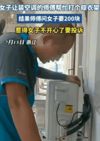 白嫖翻车了!浙江,一师傅到一女子家安装空调,干活歇下脚的功夫,女子让师傅等下搞好了顺手帮她打个晾衣架,师傅一听,让女子顺手给他200块,结果女子恼羞成怒,扬言要投诉!