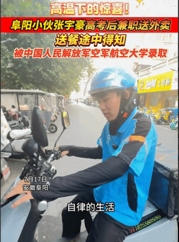 “光宗耀祖了!” 安徽阜阳,外卖员正在送餐,不料手机收到消息,得知自己被中国人民解放军空军航空大学录取,原来他是一名刚刚高考完的考生,因为不想暑假荒废在家,所以出来兼职跑外卖了