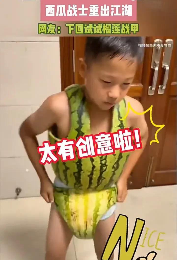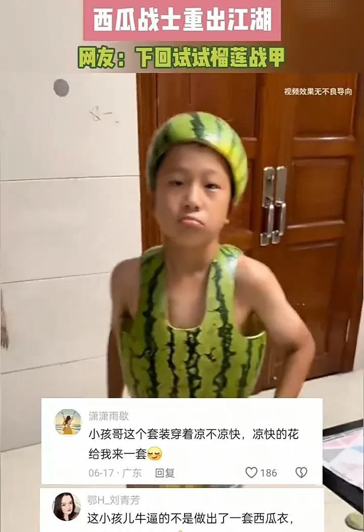 太有创意了!近日,贵州一个男孩因为天气太热,便用西瓜皮做了一套“衣服”,只见他头