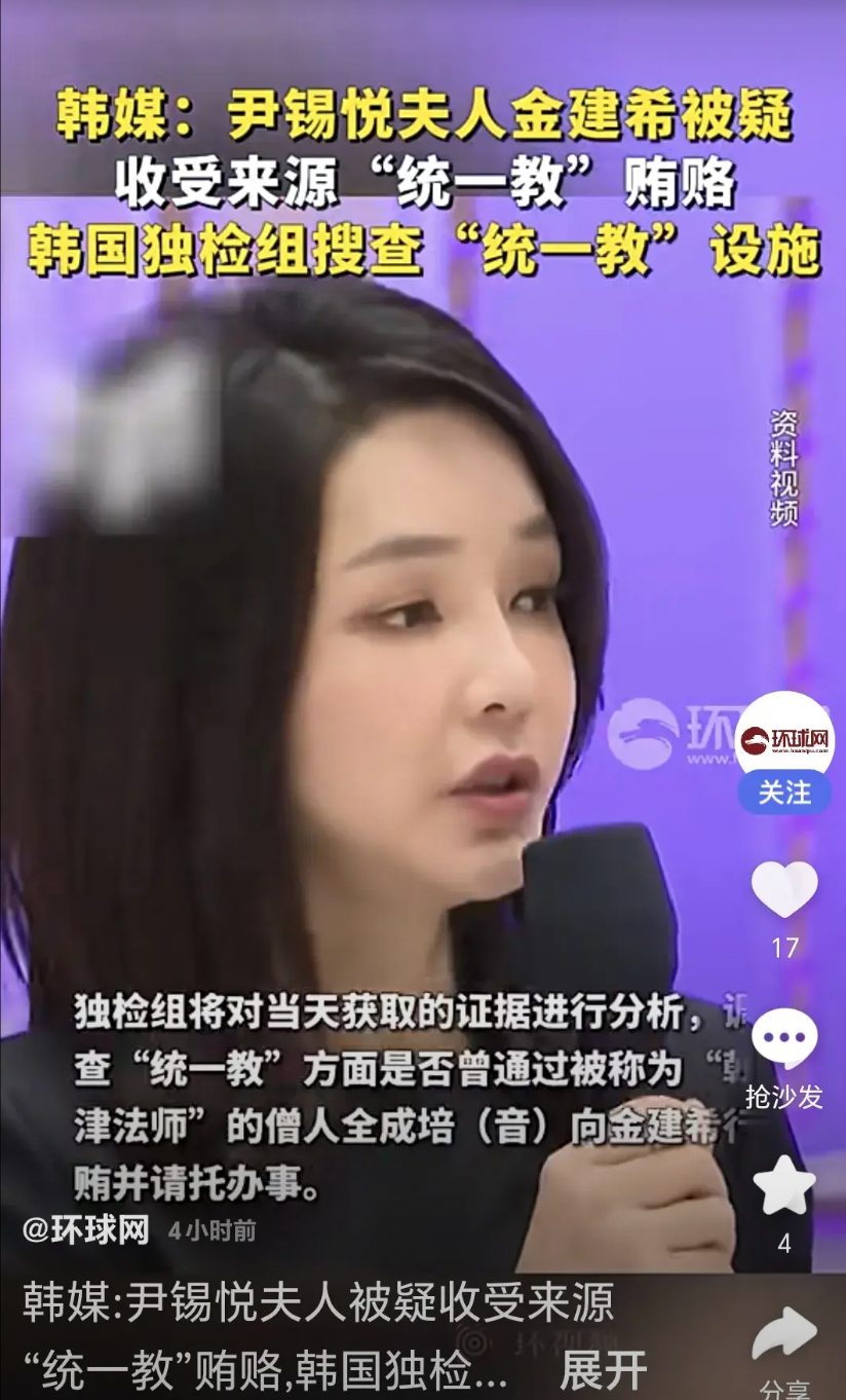 韩国前总统尹锡悦的老婆也可能要陪丈夫住监了。 7 月 18 日, 韩国独立检察组对统一教位于首尔和京畿道加平郡的涉嫌进行搜查, 调查前总统尹锡悦夫人金建希涉嫌通过僧人全成培收受该教派钻石项链和名牌包等贿赂, 并为其请托办事。 其实韩国总统尹锡悦之所以倒台, 与他这个夫人有很大的关系。 他这个夫人不仅受贿, 而且他还插手股票交易, 干预政治。 而且尹锡悦之所以要采取戒严, 也与他这个夫人有关。 尹锡悦对他老婆可谓是言听计从,太宠这个老婆了。 而且他这个夫人还在学历上造假。 所以说有一个好的老婆也是一个人能否保持成功的重要原因。