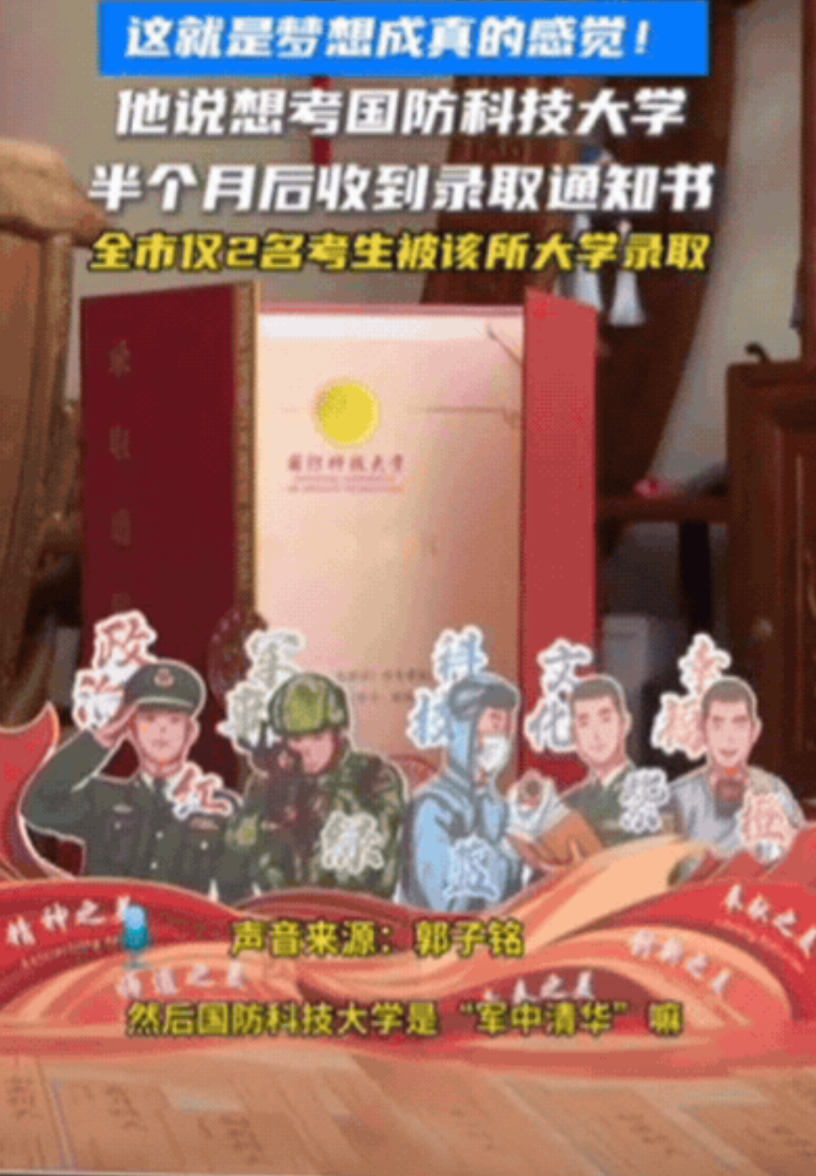 全市仅2名考生被国防科技大学,男生就是其中之一,国防科大可不是随便能考上的,这男生说到做到,太牛了!看着都替他开心,这才是青春该有的样子,为梦想拼一把,值了!