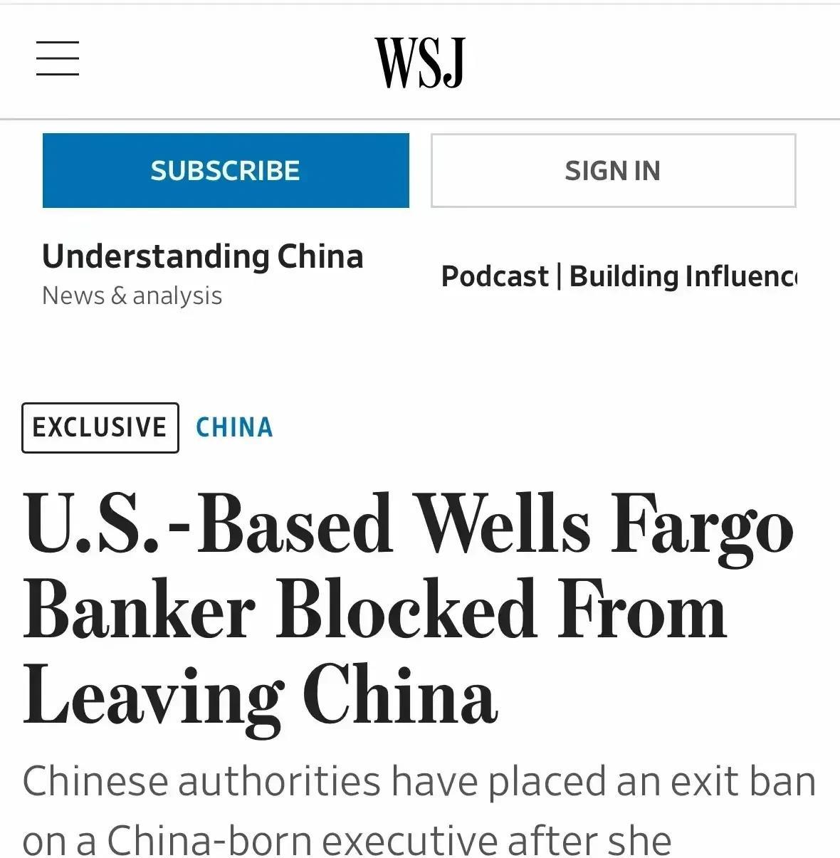 美国媒体报道称,富国银行高管毛晨月进入中国之后被拒绝离境! 前几日,一对中国工程