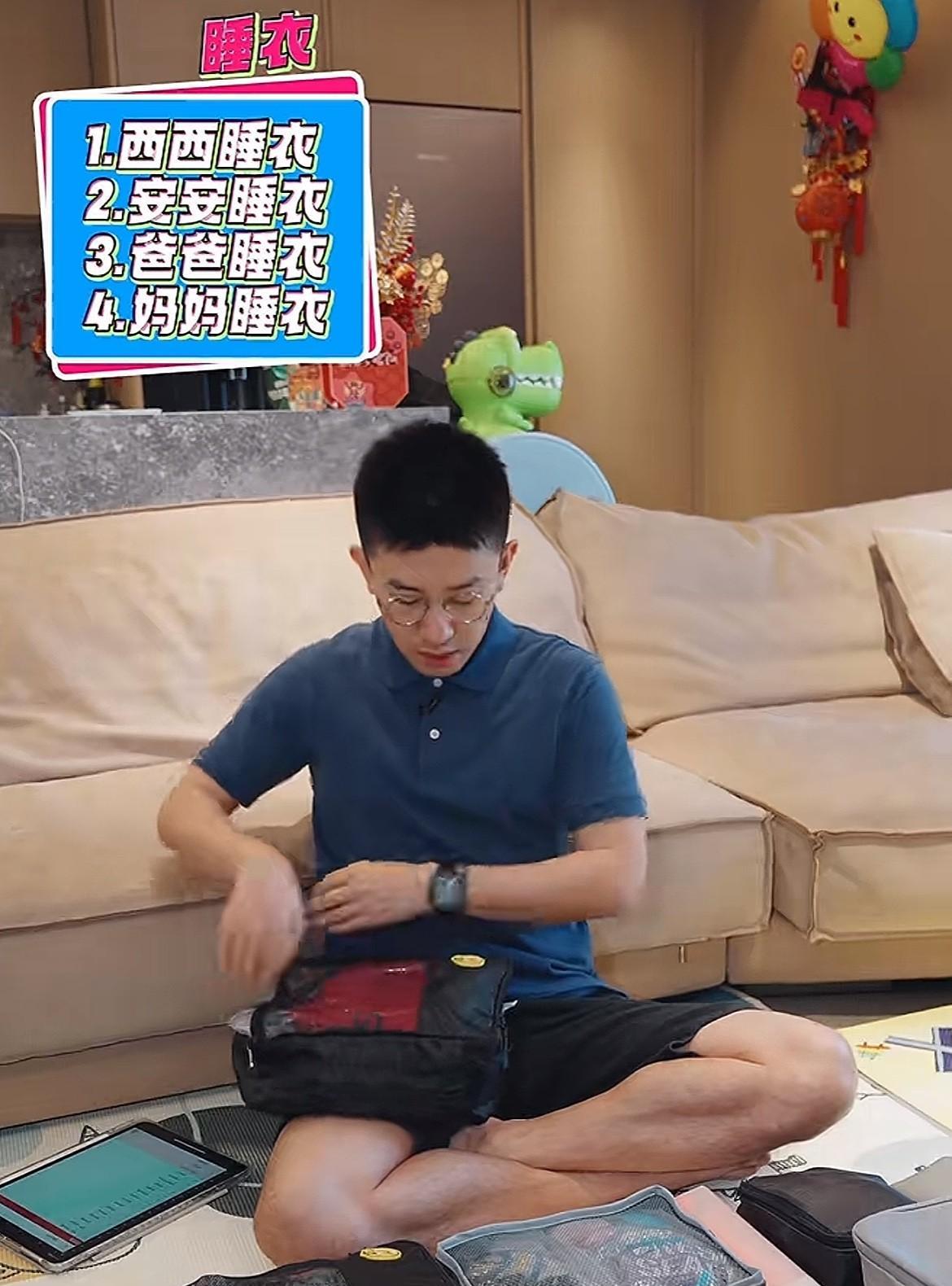 7月18日,跳水世界冠军吴敏霞在社交平台发布视频,一家四口要出去旅游了,这出去旅游的行李怎么收拾呢!老公张效诚来了个自告奋勇,他要收拾行李!先在电脑上做好了攻略!该拿什么先列表! 先准备好身份证,护照,船票复印件,行程表,国际信用卡,各种复印件,再打包自己日常用的洗面奶,剃须刀,给一双儿女拿的睡衣拖鞋,再就是孩子日常穿着,还给孩子准备了防晒衣,当然出去旅游必须带好常用的药!吴敏霞嫁的好啊,张效诚是个非常心细的人!一会儿功夫就收拾好了,得到了夫人的夸奖! 这个视频吴敏霞展现了张效诚收拾行李,我们也学到了,下面图片都有旅游需要带什么,这样的收拾行李不错,值得学习!夫妻俩年龄般配,想法同步、真的非常配!