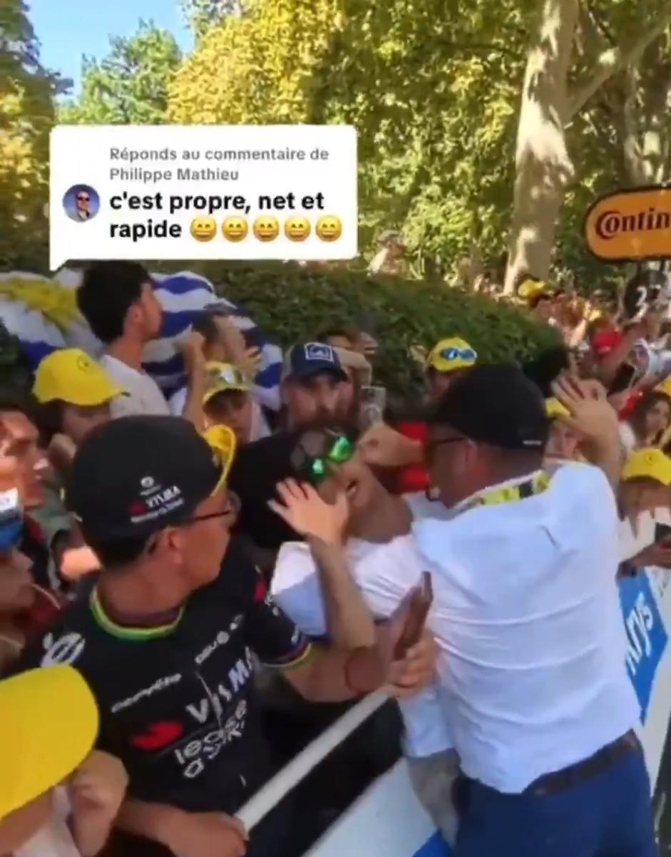 7月19日,一名支持“自由巴勒斯坦”的抗议者头戴巴勒斯坦头巾,突然闯入环法自行车赛赛道,抗议以色列车队参赛。现场安保人员迅速干预,抓住抗议者耳朵并将其强行拖离赛道,扔过护栏,按在地上又揍了几拳,事件导致比赛短暂中断,引发观众对该名抗议者捣乱赛事的指责,这些人去哪里就破坏到哪里。 现场观众愤怒的说:法国不是加沙,哈马斯滚! 赛事组委会谴责抗议行为危害选手安全,环法官方称将配合警方调查,同时加强赛道管控。