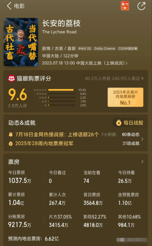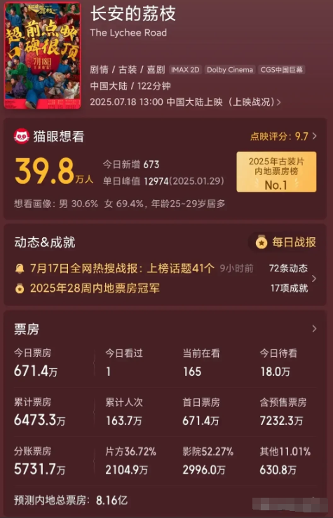 新的一天,大鹏导演的《长安的荔枝》总票房预测降了1.5亿,大鹏依然能赚钱。 即便预测总票房降到6亿,大鹏和制作投资公司也能分到2.2亿。 这部电影最大牌主演就是大鹏,至于杨幂,刘德华像是客串,给不给钱都不一定。没特效,没片酬高的演员,宣发也是以大鹏为主,最大成本反而是拍摄。 现在电影市场只要不亏本就很厉害,能赚钱就更厉害。另一部姜文的《你行!你上!》,老演员不少,裤衩赔掉。