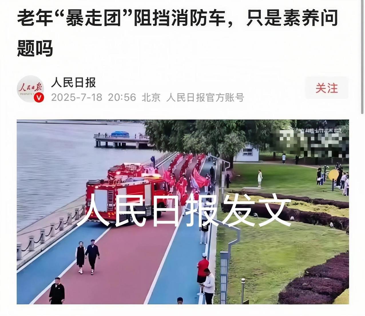 后续来了,“暴走团”群主回应阻碍救护、消防车:车辆属于备勤状态,就一分钟,为了队员们的安全,想让队员先过去! 朋友们,“暴走团”群主这样的回应,您接受吗? 我是不接受的! 暴走团成员都是成年人,大多数应该都是退休人员,都是老人,他们的社会阅历不可能不知道。遇到救护车和消防车执勤时,应该让行。 对这些老人讲大道理,我觉得是非常讽刺的,应该是老人给年轻人讲道理,但现实就是,这些“暴走团”成员很没素质,确实需要重新教育。 说什么“为了成员安全”“就一分钟”等等,我觉得这都是借口。 如果真是为了安全暴走团成员,怎么敢在马路上“暴走”?有时一条马路甚至占据了3/4,如果是为了安全,岂不应该在人行道上? 7月18日,人民日报都发文质问:这是素质问题吗? 确实! 这涉及的不仅仅是素质问题了。 咱这样想吧,如果这些人是年轻人,有可能就被拘留了吧? 所以对这些“银发老人”,在法律法规面前不能双标啊! 实在不行就领进派出所教育一番,然后让其儿女来领,让儿女批评,或者儿媳妇,他们总该会听话吧? 还有网友建议停发他们的退休金,我知道这是网友的气话,肯定不现实。 但这个建议是好的!