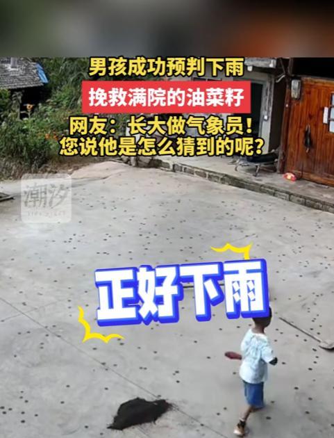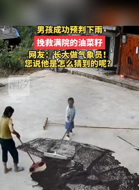 神预测!贵州,一位小男孩站在院子里,突然抬头看看天,说:“奶奶,要下雨啦,快把油菜籽收起来!”奶奶一听,二话不说立马动手。没多久,豌豆大的雨点就真的砸了下来,满院子的油菜籽因为孩子一句话,被及时抢收了!孩子妈妈也忍不住感叹:也许是他平时太喜欢观察天象了吧,反正家里人都开始佩服起这孩子来了。 根据四川观察7月18日的视频,这天下午,一位小男孩晃着手,从外面慢悠悠走了过来,大声对奶奶说,快点把油菜籽收了,一会要下雨呢! 奶奶连忙拿来工具收菜籽,现在对于这个小孙子的话,她是不敢不听,毕竟前天孙子也不断提醒她要下雨了,想让她收菜籽。 起初奶奶以为就是小男孩乱说的,也没在意,继续在屋子里忙活着,然而没过多久,外面就淅淅沥沥下起了雨,再想收菜籽已经晚了,一大半都被淋湿。 所以这次小男孩说要下雨,她就赶紧拿工具,快速的收起菜籽,小男孩也拿来工具帮忙,就在祖孙二人把菜籽收的只剩小小一堆时,豆大的雨滴就砸了下来。 小男孩连忙用小小的身体护住,奶奶这时也拿来东西,把菜籽全部扫了起来,这才避免被再次淋湿。 视频一出,网友纷纷表示,这孩子简直是行走的小气象台,能准确感知天气变化,将来可以去当气象专家! 也有人表示,自己小时候下雨前也会闻到一股腥味,每次闻到就知道要下雨了! 对于这件事,大家有什么想说的呢?欢迎在下方说说分享一下!