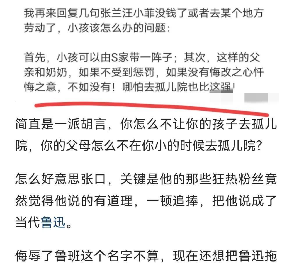 朱孝天再次发文力挺汪小菲,大S支持者竟然说把孩子送孤儿院也比跟着爸爸强! 一位大S的支持者作家鲁班说,不如送孩子去孤儿院,这样的父亲不要也罢。 这么看来,作家鲁班也不相信S家愿意照顾孩子,但也和S家一样希望汪小菲垮掉,可是让孩子去孤儿院过分了,汪小菲罪不至S吧,太恶毒的想法了!
