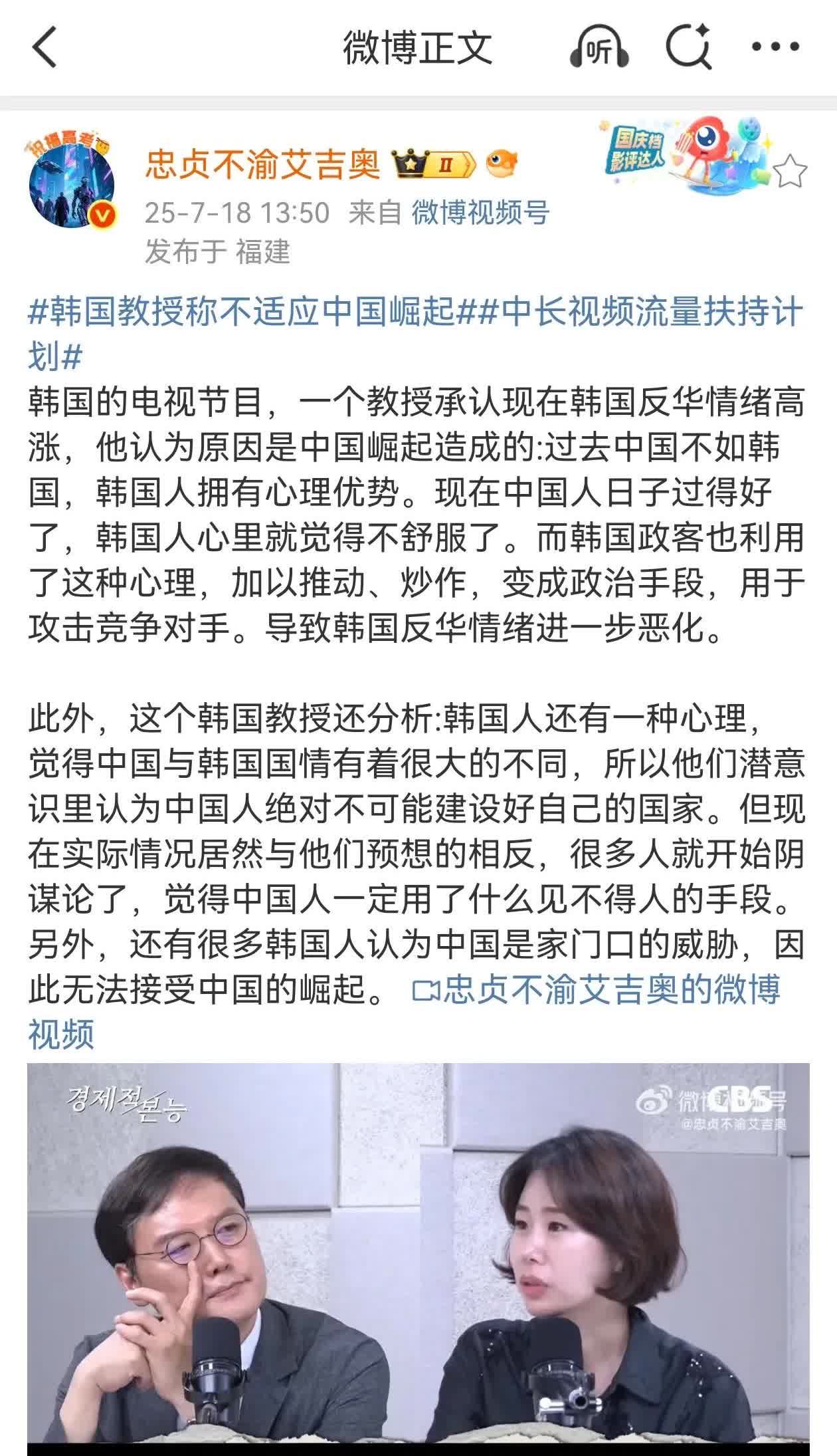 嗯,这就是现在周边小国面对中国重新掘起的心态——韩国教授:韩国人现在反华情绪严重