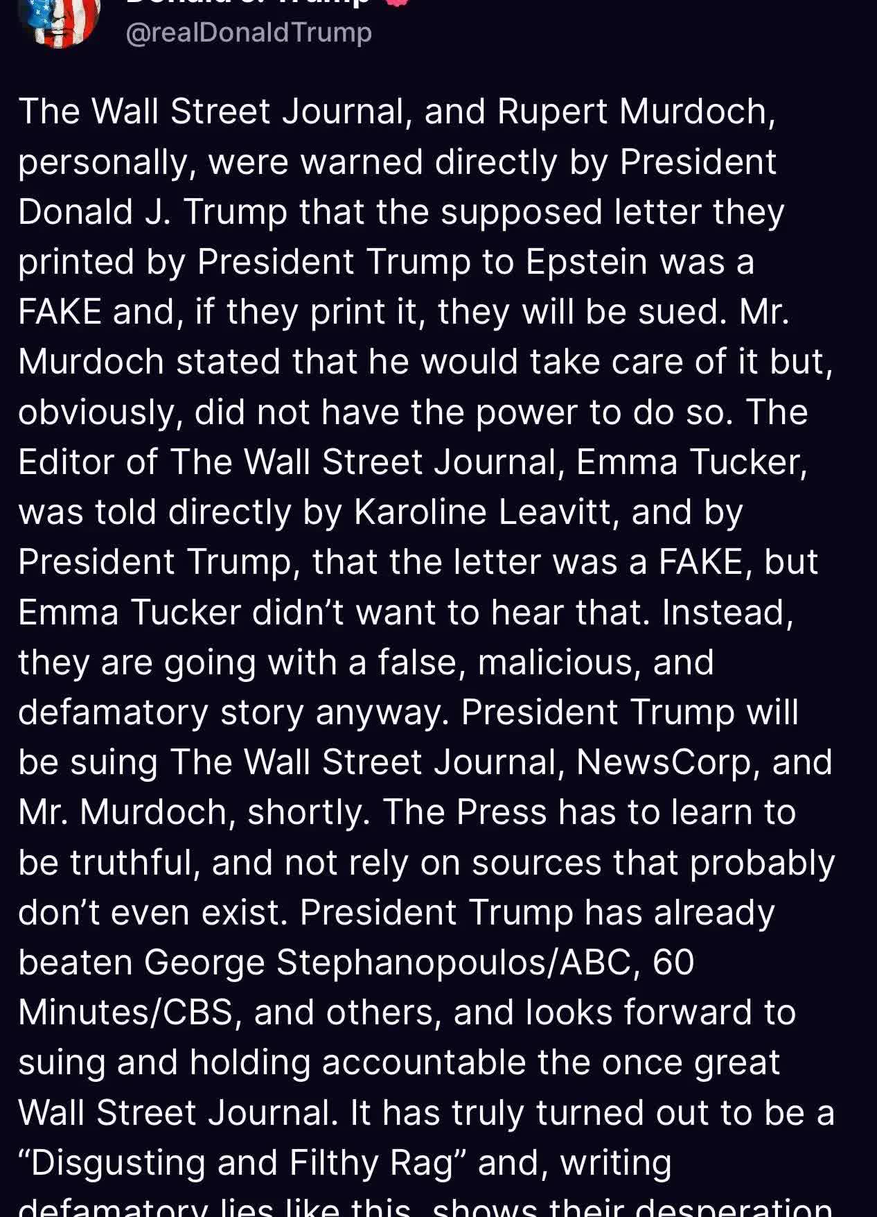 华尔街日报爆料特朗普曾为爱泼斯坦50大寿写“粗俗贺信”。2003年,爱泼斯坦的前女友兼妈妈桑麦克斯韦为一本生日纪念册收集了来自特朗普及爱泼斯坦其他数十位熟人的信件。这本皮革装订的纪念册中信件风格类似。特朗普信件中有几行打字文字,边框则勾勒出一个女性的轮廓…总之就是内容粗俗。 这封信内容被设计成一段特朗普与爱泼斯坦之间的虚构对话,以第三人称的形式呈现。 文字开头写道:生活中一定还有比拥有一切更重要的东西。 特朗普:是的,确实有,但我不会告诉你是什么。 爱泼斯坦:我也不会,因为我也知道那是什么。 特朗普:我们之间有些共同点,杰弗里。 爱泼斯坦:确实如此,现在想想也是。 特朗普:谜一样的人从不会老去,你注意到了吗? 爱泼斯坦:事实上,我上次见你时就很清楚了。 特朗普:朋友是一件美好的事情。生日快乐——愿每一天都成为另一个美妙的秘密。 在周二晚间接受《华尔街日报》采访时,特朗普否认写过这封信或画过那幅画。“我这辈子从没画过画。我不会画女人。”“那不是我的语言,也不是我说的话。” 华尔街日报发表这篇报道后,特朗普立即宣布起诉!他在声明中说:《华尔街日报》及鲁珀特·默多克本人曾被特朗普直接警告,称该报所声称刊登的特朗普写给爱泼斯坦的信件是伪造的;若报道刊出,他将提起诉讼。默多克先生当时表示会处理此事,但显然他并没有能力阻止这一报道。《华尔街日报》主编艾玛·塔克也被白宫新闻秘书卡罗琳·莱维特及特朗普本人亲自告知,这封信是伪造的,但塔克对此置若罔闻。 相反,该报仍决定刊登这篇虚假、恶意且具诽谤性的报道。特朗普表示,他即将对《华尔街日报》、新闻集团(NewsCorp)及默多克本人提起诉讼。