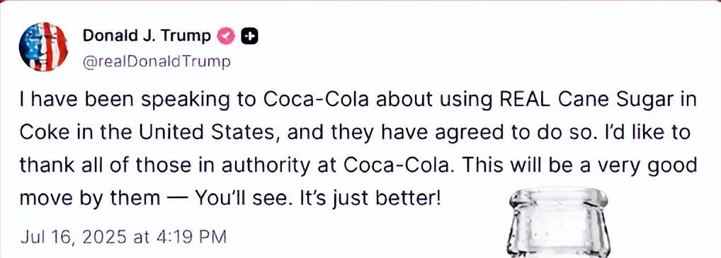信息来源:环球时报2025年7月18日《被特朗普说服“更换配方”?可口可乐回应》