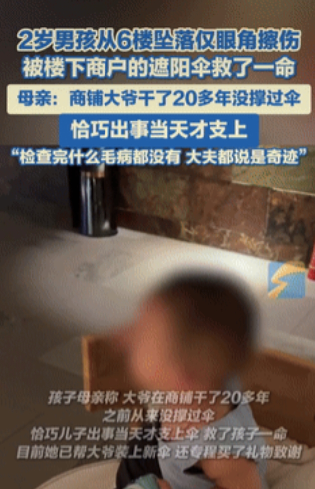 “这下解释不清了!”黑龙江哈尔滨,一2岁男孩从6楼意外坠落,稀奇的是他就眼角有擦伤,并无其他的问题,只因楼下的遮阳伞接住了他,但那把伞已经20多年都没打开,恰巧出事那天,其主人把伞给打开了!
