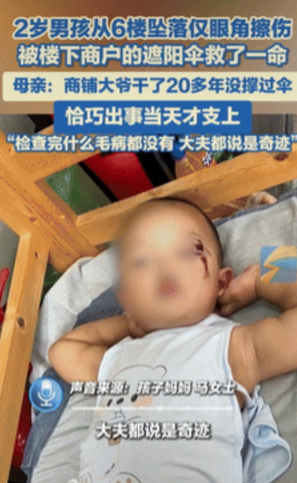 7月18日下午,一个2岁的小男孩从6楼窗户掉了下来,按理说这种高度基本没有生还可能,可孩子竟然只是眼角擦破了一点皮。