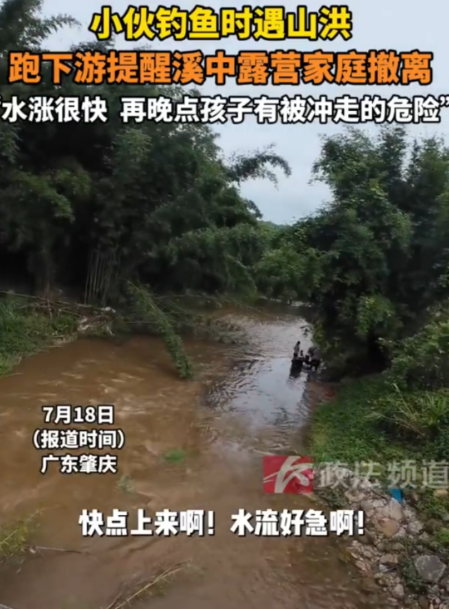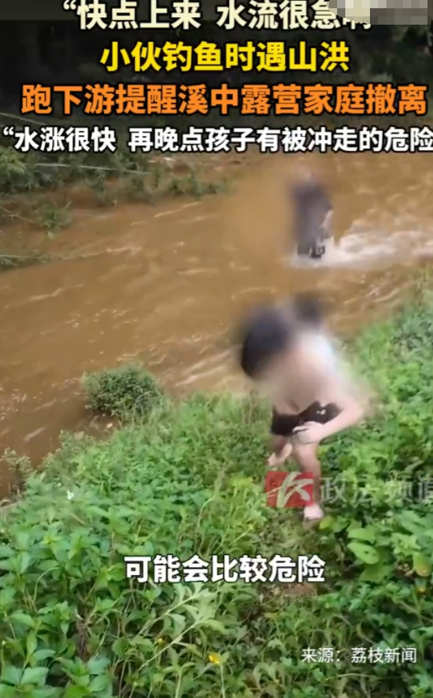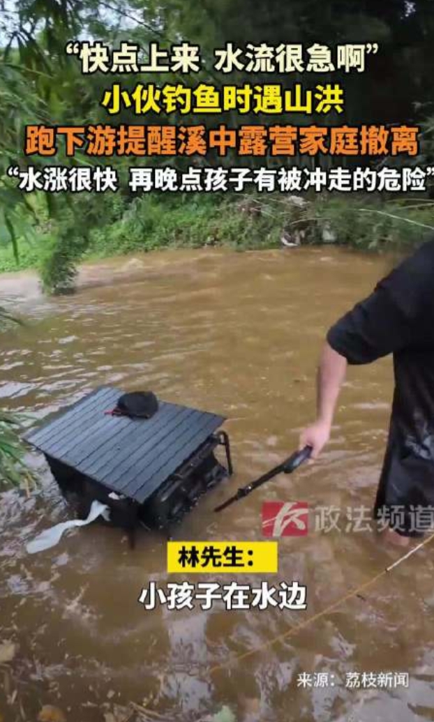 信息来源:《小伙钓鱼时遇山洪,跑下游提醒溪中露营家庭撤离》长沙政法频道