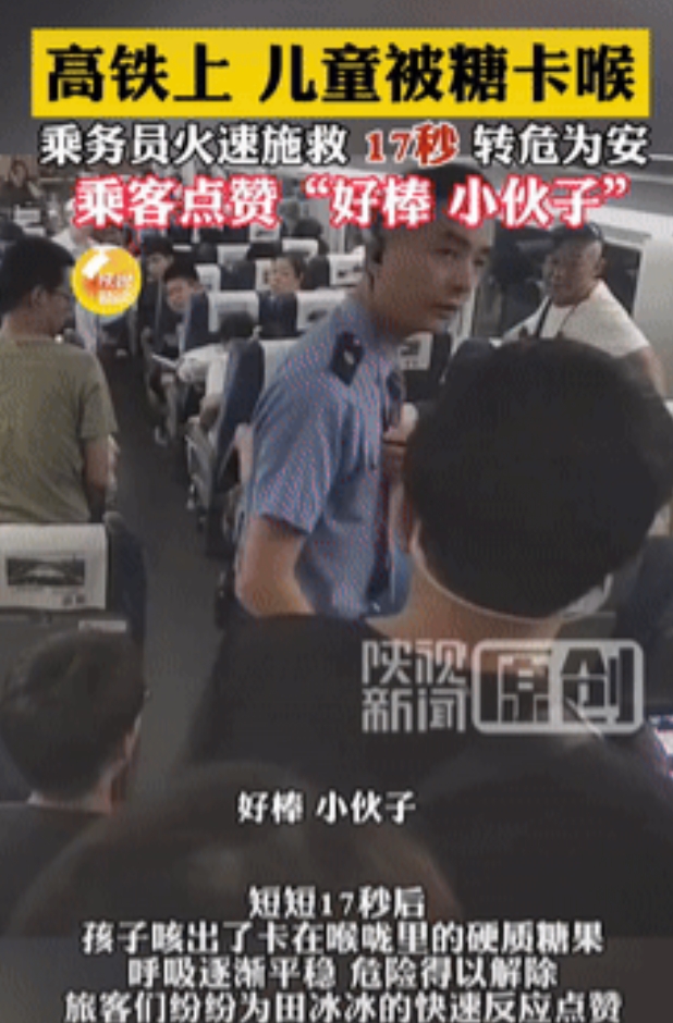 遇到贵人了!高铁上一儿童吃糖被卡住,一旁的家长急的手足无措,在这危急时刻,乘务员听到动静后急忙赶来,而他仅仅用了17秒,便成功让孩子脱离了险境!网友:这必须要升职加薪了! 据陕视新闻7月18日的报道,当时车厢里的乘客们,要不在闭着眼休息,要不就是在玩手机,谁能没想到一场惊险的救援即将上演。 有位家长突然发现,身旁的孩子脸色变得通红,小手不停地抓挠喉咙,嘴里发出“嗬嗬”的喘息声。 原来孩子吃糖时,不小心把整颗糖吸进了气管,眼看着孩子的呼吸越来越微弱,其家长急得手足无措。 就在这紧急时刻,列车上的乘务员,听到求救声后赶紧过来,当看到孩子的情况后,立马就判断出他的情况,二话不说就开始救助。。 他让家长把孩子抱起来,自己则从背后环抱住孩子,双手握拳放在孩子肚脐上方,开始进行海姆立克。 不得不说,这次要没有乘务员的话,那孩子可就危险了,毕竟被东西卡住导致窒息,可没有那么多的时间,去等专业的医生过来。 要是那样很可能就会错过最佳的抢救时间,孩子接下来会面临什么样的结局,就无法想象了。 而旁边的乘客们也都目不转睛地看着这一幕,就这样,在乘务员的努力下,糖果成功从孩子的嘴里喷出来,而从开始施救到孩子脱险,整个过程仅仅用了十七秒。 当看到孩子脱险后,他并没有过多停留,只是简单嘱咐了家长几句,就回到了自己的工作岗位继续去工作。 对于经常带孩子出行的家长来说,再给孩子吃零食时,千万要特别注意安全,最好选择不易卡喉的软质食品。 同时,也建议每个家庭都有人,学会基本的急救技能,毕竟意外随时可能发生,真当那时候到来的时候,是能够起很大作用的。 那么对于这件事情,您有什么想说的呢? 信息来源:陕视新闻 《高铁上一儿童被糖卡喉,乘务员快速反应施救,17秒后孩子转危为安。》2025-7-18