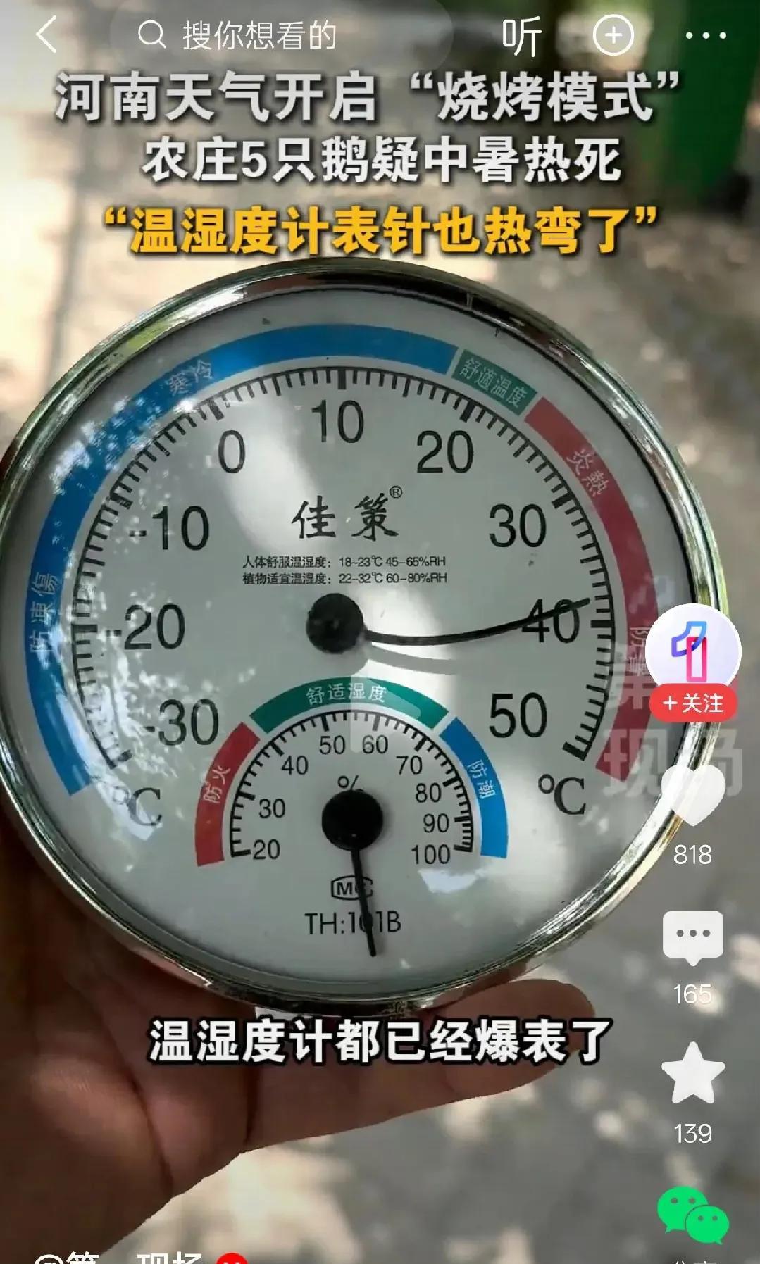 热炸了!河南新乡,男子养鹅十年头一遭遇“高温杀鹅”,5只鹅直接热死在水里,温度计表针都晒弯了!男子心疼地把鹅一只只捞出来,直叹:“我真是没想到水里也能被热死!”现在他每天给鹅喷井水降温,连风扇都安排上了。网友:“鹅都热熟了,咱们人类真的也快熟了!” 根据第一现场7月14日的视频,这天,男子像往常一样来到自己的养鹅场,想着给自家的鹅弄点吃的喝的。 自己还害怕鹅热,专门把它们圈在水边,想着鹅如果热,也能下水凉快两块。 但是令他没想到的是,自己刚到鹅厂,就看到有几只鹅静静地飘在水面上一动不动。 男子连忙上前查看,用旁边的棍子把飘在水面上的鹅给捞过来,等捞上岸,男子发现鹅已经没了气息。 他一个接着一个捞,一共捞上来五只鹅,他十分疑惑,然而这些疑惑在看到温度计的时候,全都被打消了。 温度计直接爆表,就连指针都被热弯了,他在一测水温,竟然直逼五十度! 男子十分心疼,因为鹅本来就是耐热耐寒的动物,他也没想到天气这么极端,直接导致他损失五只大白鹅。 出了问题就得解决,男子很快振作起来,禁止其他鹅再去池塘降温,转而安装几个喷洒头,采用喷洒的行为进行降温。 事情一出,网友纷纷表示,今年热得真的离谱,人都要蒸发了,真的心疼被热死的大鹅。 也有人表示,鹅现在都需要”大降温“了,看来今年是真的“热炸天”。 对于这件事,大家有什么想说的呢?欢迎评论分享,说说大家的看法!
