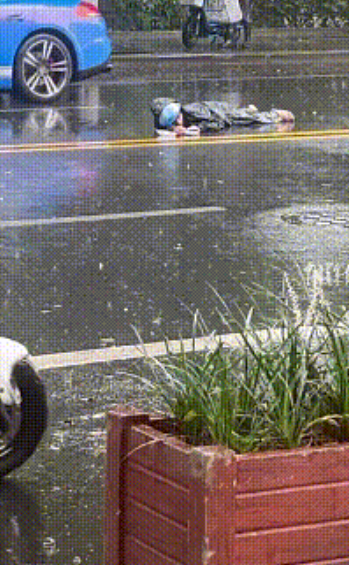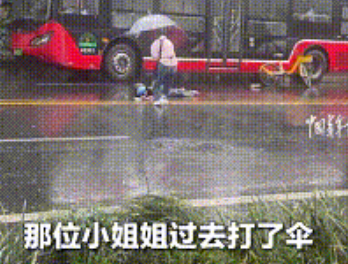 小哥就这样一直被雨淋着也没有人管他,在等待救护车来的期间,一名打伞的女孩出现在了画面中,画面显示她一路小跑朝着小哥跑了过去,随后蹲下将手中的雨伞放到地上为小哥遮挡住头部。