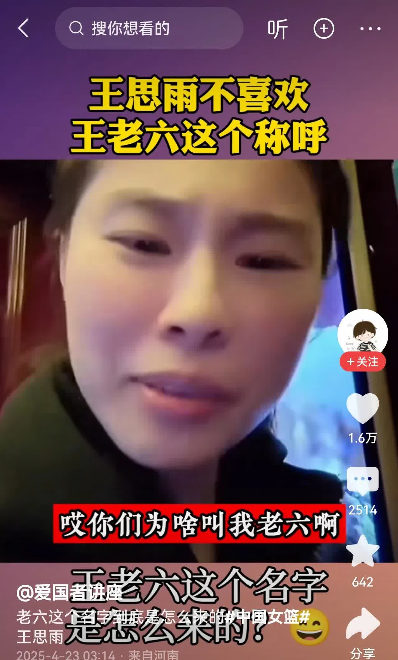 王思雨满脸委屈的说:求求各位了,别叫我老六了,不喜欢老六这个名字。哎,你们为啥叫我老六啊?我就想知道。 说实话,王思雨不光打球很帅,说话的表情和样子也这么可爱,连“委屈”这样子也这么美。 哈哈。为啥叫你老六啊?实际是夸你呢。就是因为你打球麻溜了呗,能偷、能抢、能投、能断、能防、能守六大技能出色。 所以说 老六,绝对是褒义,除了王思雨没人能配得上。希望王思雨能够一直老六下去。 哈哈,家人们,我这么理解对吗?如果说的没毛病,请伸出你高贵的小手,支持一下点个赞!