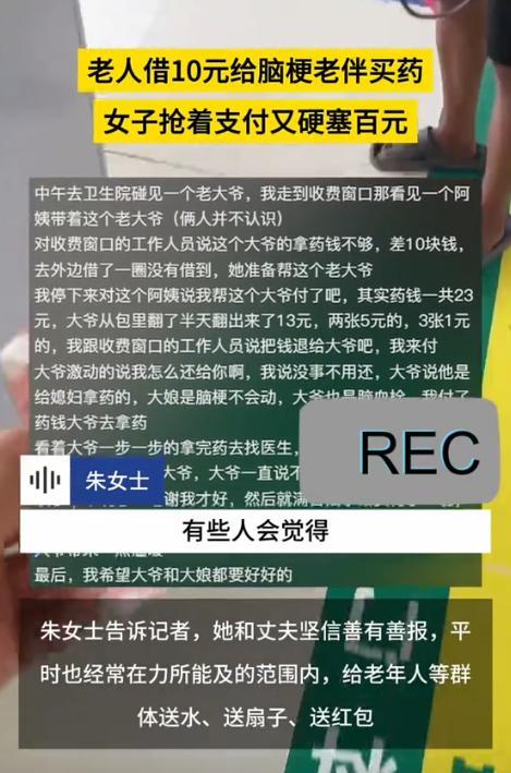 “泪目了!”河南开封,一老人在卫生院缴费窗口拿药差10元,他去外面借了一圈都没有借到,就在手足无措之际,一旁的女子看到后,直接对收费的工作人员说:我来付吧!老人十分感激:那我怎么还你的钱呢?然而女子接下来的一句话让老人泪目! 据极速新闻7月18日报道,老人借10元给脑梗老伴买药,女子抢着支付又硬塞百元。 “我们都坚信善有善报!” 在开封一家卫生院,来来往往的患者和家属让整个走廊都显得格外嘈杂。 大家脚步匆匆,不是排队挂号缴费,就是拿着单子来回穿梭。 一大早,一位头发花白的大爷就出现在了缴费窗口。 他老伴因为脑梗卧床多年,每天都得靠吃药维持。 他紧紧攥着手里的布包,里面装着他东拼西凑来的药费——几张皱巴巴的纸币,还有一堆硬币,全是他省吃俭用攒下的。 缴费时,他小心翼翼地把钱倒出来,自己一边数一边念叨着,希望钱能刚刚好。 可没想到,工作人员一报价格,大爷顿时愣住了——还差10块钱。 这10块钱,对别人来说可能不值一提,但对他来说却像一堵墙,一下子把他卡在原地。他站在窗口前,手足无措,连话都说不利索了。 犹豫了半天,他硬着头皮走出门,低声地向路人开口想借点钱。 可路人不是摆手说没带现金,就是匆匆离开。 就在他快要放弃的时候,排在一旁的朱女士注意到了这一幕。 她一看就明白了怎么回事,没多想,直接对窗口工作人员说:“这药钱我来付,大爷的钱退给他吧。” 大爷一听这话,满眼都是惊讶:“姑娘,不行啊,这怎么好意思?我怎么还你?” 朱女士笑了笑:“大爷,别客气,您快拿着药回去,大娘还等着用药呢。” 本以为她付了钱就走了,结果她又从医生那换了100块零钱,悄悄塞进大爷手里,说:“你回去给大娘买点东西,装好了别丢了。” 大爷一边抹眼泪一边摇头,他万万没想到,在这么难的时候,会有个素不相识的姑娘愿意伸手拉他一把。 后来才知道,大爷老伴瘫痪好些年了,家里条件非常拮据,这10块钱对他们真的不是小事。 而朱女士和丈夫平时就热心公益,给环卫工送水、给老人送扇子,有困难的她总想帮一把。 这事被传到网上后,很多人看完都被感动了。 有人说,朱女士的10块钱,不只是解决了买药的问题,更是给了大爷一份体面和尊严。 还有人说,在这个什么都讲效率的时代,能看到这样不求回报的善举,太难得了。 也许10块钱、100块钱,在有些人眼里只是零头,但在那一刻,它们是温暖,是希望。 信源:极速新闻
