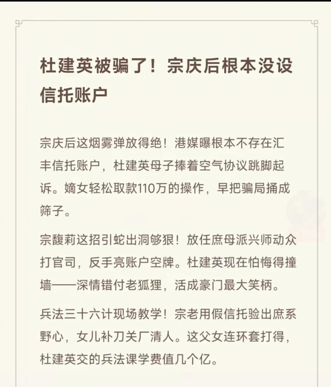 杜建英其实也蛮可怜的,年轻的时候就委身于有钱的花心男人,虽然结婚生育了几个孩子,却一直没有名份,像个地下情人似的。 60岁的她又被捉弄了一次,所谓的汇丰信托账压根就是不存在的,最后不过是一场空欢喜。老爷子为了生前身后的诸多光环以及家族利益,根本就没考虑过她们娘仨的权益,她连个备胎都算不上。 现在想要索要遗产,哪知道却遭到网民的口诛笔伐,吓得躲在幕后,始终不敢站到台前来辩解几句。 这起诉的官司搞不好会败诉,还白白搭进去不少诉讼费。