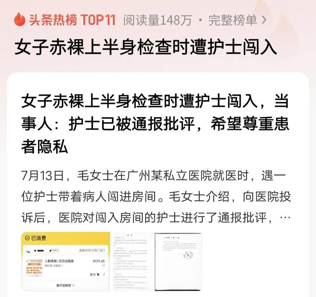 广州,女子躺着做心电图时,衣服撩到胸口,上身露着,一护士不顾前台阻拦,带患者直接闯进来,女子顿感屈辱、尴尬,流下眼泪,脑子闪出一个念想:被看光了!而后女子心率波动,又被告知多躺了5分钟,才把检查做完,事后,护士简单道歉,女子给了差评,医院表示赔偿68块,女子未接受,可看到通报护士,又觉得于心不忍。 7月13日是毛女士不堪回首的一天,她在某家私立医院做体检,遇到了尴尬的一幕,让她久久难以释怀。 事发当天,毛女士躺在床上做心电图,按照要求,她将衣服撩在胸口,为的是方便检查,所以,她上半身是露着的。 毛女士做检查时,检查室没关门,只是拉上了帘子,不曾想,一个护士带着患者进来看了一眼。 当时,毛女士顿感不舒服,觉得自己被冒犯到了,因为她光着上半身,出于隐私也不想被他人看到,可是,护士突然闯入让她感到屈辱。 而更让毛女士无法接受的是,当时前台护士已经劝阻了那位护士,可是,那个护士还是不管不顾,到底进来看了一眼,看有人,然后出去了。 毛女士心理十分不舒服,觉得隐私被人侵犯,而这时给她做检查的人告诉她,她的心率有波动,让她再多躺5分钟,缓和一会情绪稳定了再做。 此刻,毛女士抑制不住心里的委屈,躺在床上,不停的流眼泪,脑子里只有一个念想:被人看光了! 毛女士脑子里不停的回放着刚才尴尬的画面,她觉得万分委屈。 事后,毛女士追究了这件事,那个闯进检查室的护士给她简单的道了歉,说是因为有患者需要检查,才这么做的。 毛女士觉得这个理由有点敷衍,她拍了对方的工牌,给了对方差评。 很快,有了结果,7月14日,医院通报了那名护士以及所在科室。 毛女士对通报结果,有些于心不忍,她表示不想因为这事对护士有更严重的处罚。 甚至,反问自己因为几分钟的屈辱让护士受到批评值得吗? 不过,毛女士认为,医院应该重视保护患者的隐私。 而且,医院也提出赔偿毛女士68元,毛女士拒绝了,她更希望医院给她发一封道歉信。 另外,医院通报后,毛女士也删除了差评。 这事在网上引起了讨论。 有人说,应当尊重患者隐私,无论男女做心电图,被无关人员看到隐私部位的确实尴尬,那个闯入的护士职业素养不行,罚的不冤。 还有人说,护士是男还是女?如果是女的没必要大惊小怪,要是男的确实鲁莽。不过,病人没有男女之分,也没必要小题大做。 但这件事中,女护士带着其他患者,这也是让毛女士感到不适的原因。 毛女士的遭遇也说明了一个普遍现象,护士强行闯入检查室,表面上看是“疏忽”或者急于为其他患者服务,其实是,在隐私保护上面存在漏洞。 检查室没有锁门,只靠隔帘遮挡,这说明保护患者隐私的地方做的不到位。 而护士不顾前台劝阻,直接闯入,也说明没有重视患者隐私优先,对患者隐私缺乏该有的尊重。 另外,既然前台劝阻了,说明有规定不该擅自闯入,但护士硬闯,要么说明有关系,或者视规定为儿戏。 《民法典》第1226条规定:医疗机构及其医务人员应当对患者的隐私和个人信息保密。泄露患者隐私或个人信息,或未经患者同意公开其病历资料的,应当承担侵权责任。 毛女士在做心电图时,上半身撩起了衣服,属于高度敏感隐私场景。 护士没有敲门,且不顾前台劝阻直接强行闯入,导致毛女士隐私暴 露,对方泄露患者隐私的构成要件。 虽然,护士解释说因为患者需要检查,但是,作为护士应该尽到合理注意义务,比如,先敲门征得同意。 所以,护士的行为直接侵犯了毛女士的隐私权。 医院提出赔偿毛女士68元是否合理呢? 《民法典》第1183条:侵害自然人人身权益造成严重精神损害的,被侵权人有权请求精神损害赔偿。 首先,医院提出的68元赔偿远低于合理范围,毛女士可以主张精神赔偿。 因为,毛女士因护士强行闯入被侵犯隐私权,导致心情崩溃,心率波动,感到屈辱,流下眼泪,因此,她可以要求对方给予精神损害赔偿。 最后,毛女士将这事发到网上的初衷是想告诉大家,遇到这种情况可以投诉,保护自己的隐私。 这事一发出来,很多网友也有类似经历,确实感到尴尬,但出于一些原因没有计较,但是,想起来那种感受还是挺难受的。 大家有过这种经历吗?欢迎评论区讨论
