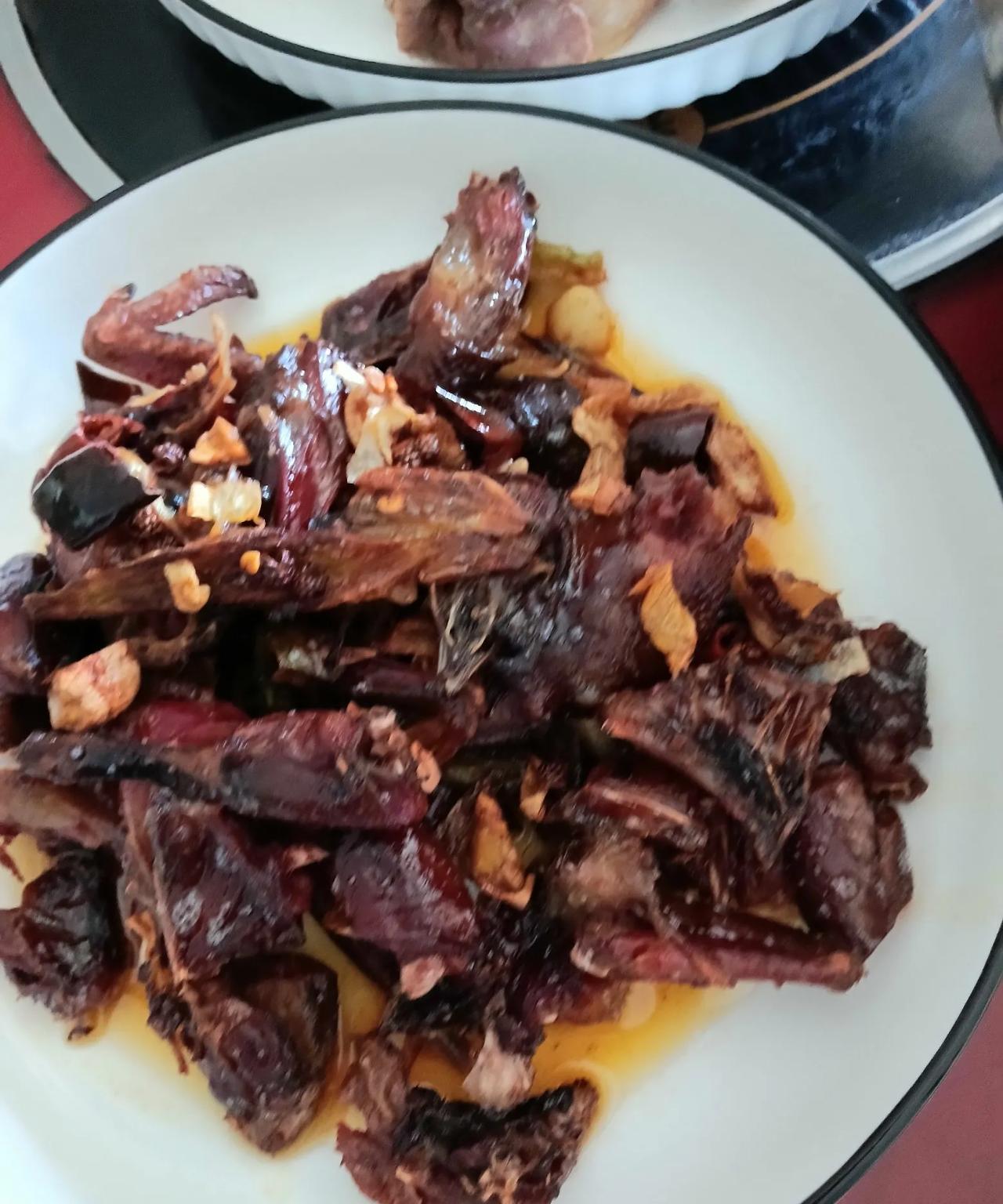 女儿放假了,我用两菜一汤招待她。大家看看这生活怎么样? 小菜不谈,大家一看便知,但另两个菜,可算硬菜。 一个清蒸猪心,这是我独创莱,新鲜猪心一只,破开洗净,放花椒几粒,老姜几片,加入重盐,适当鸡精存于大碗中,小火蒸40分钟后切片上桌。 另一个是腊鸽子,这菜是把腌制的鸽子用火烤成腊鸽,存于冰箱,食用时取出洗净根据爱好切块,加佐料炒好就行,麻辣味大小自已调味。 女儿吃着,感到很香,莱少但对味口。 家庭吃饭,量要控制,丕浪费又舒适可口为最佳。