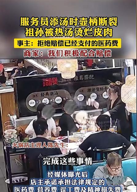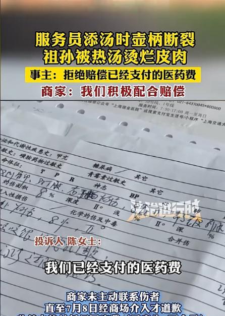 太过分了!上海,一家五口欢欢喜喜去吃火锅,本是寻常周末,没想到却因一把热水壶,酿成母女双双烫伤的惨剧——火锅店服务员加汤时壶柄突然断裂,滚烫的汤泼在了3岁孩子和外婆身上。更令人心寒的是,事发后服务员竟慌忙离开,没人急救,没人道歉,直到媒体介入,商家才“被迫”承诺承担责任。网友:“吃顿饭把娃送进烧伤科,最烫的不是火锅,是冷漠。” 根据发法治进行时7月19日的视频,这天一女子带着自己的一家五口,来到家附近的火锅店吃饭,火锅里的汤越煮越少,女子就喊来服务员加点汤。 令所有人都没想到的是,“‘咔’的一声,壶柄突然断裂,整壶滚烫的热水连同锅边的汤,一下子泼了下来! 自己的母亲和3岁女儿正好坐在外边,直接被滚烫的水烫的惊声尖叫,“噌”的一下站了起来,而那个失手的服务员脸色一白,吓得扔下壶转身跑了,现场没有任何店员上前帮忙或是进行急救。 女子只好抱着女儿带着母亲冲向后厨找水冲洗,随后,她又带母亲和女儿前往医院急诊。 母亲全身烧伤面积达8%,年幼的女儿烧伤面积达4%,然而,比起身体上的疼痛,更让女子愤怒的,是商家的态度。 事发当天,店里没人来问一句,第二天也没有一个电话,直到她主动联系商场管理方,对方介入协调,店主才终于现身,口头道歉。 更让她无法接受的是,商家并没有主动垫付任何医药费,只提出通过商业保险进行理赔,她断然拒绝。 直到媒体曝光,火锅店负责人终于出面表示,将承担“法律规定的合理赔偿责任”,并承诺“配合阶段性结算”。 事情一出,网友纷纷表示,服务员失误,跑了也没人接手,这店的培训和管理也太不到位了吧! 也有网友表示,这要是我家孩子被烫成这样,哪还有心情等保险?商家太冷漠了! 对于这件事,大家有什么想说的呢?欢迎在评论区说说你的看法!