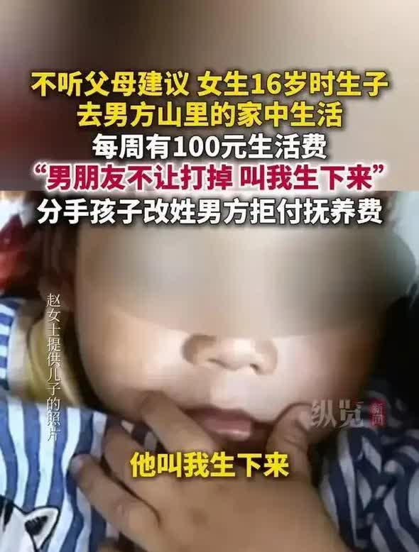 重庆,16岁女子跟男子恋爱,发现自己怀孕后,父母劝她打掉,可女子不听劝,跟父母断了联系,回到男友老家生下孩子。男友每周给她100元生活费,还说她用钱太多,太浪费了。3年后,女子找了工作,把孩子接到父母家,给孩子改了母姓,男友将她拉黑,两人分手,女子要求对方,把孩子的生活费给了,可男友父亲的回答,让她更加恼火。 最近刷到重庆酉阳一位00后妈妈的事儿,看完真是让人心里不是滋味,这姑娘叫小赵,今年才19岁,怀里却抱着个3岁的娃,回娘家靠着父母帮衬过日子,孩子的爸爸早就没了踪影。 网友说: 干得漂亮哦,32岁可以当婆婆,48岁可以当主主,64可以当太太,前途无量[赞][赞] 有的网友说: 所以说不要恋爱脑,要想清楚再去做,不然害的是自己 还有的说: 评论区里面都说离婚了,带儿子不好嫁,为什么离了婚一定要结婚呢?这是什么思维逻辑呢?只谈恋爱不结婚,不可以吗?婚姻是坟墓,都离开坟墓了,为啥还要进去呢?把孩子安心养大,好好赚钱,空闲了,想谈男朋友就谈一个,不想谈了就分手,没必要用婚姻把自己束缚住 大家怎么看呢?
