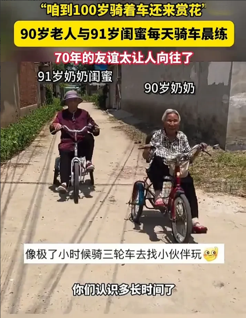看到这位90岁老人和91岁闺蜜每天相约骑车去晨练的画面,真的令人感到温馨。这两位老人的年龄都已经很大了,但是她们的友情却越来越深,已经陪伴彼此走过了70年风风雨雨,同时她们的身体也很健康,想来应该是经常晨练的缘故,这样的生活真是让人羡慕。大家怎么看呢?