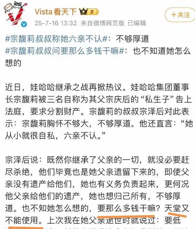 要那么多钱干嘛,天堂又不能用。宗馥莉的叔叔是该多恨这个侄女儿?谁家亲叔叔会这么说自己的亲侄女儿? 宗的叔叔说她不够厚道,还说要那么多钱干嘛?天堂又不能用。 这个叔叔看来是恨毒了这个侄女儿,不然不会说出这么狠毒的话。 这个叔叔觉得宗馥莉继承了宗庆后的遗产,就有责任照顾宗庆后的其他子女。 看来宗家早就承认了杜生的那3个孩子,而且宗家的产业里那3孩子也并非没有染指。 其实他们都不缺钱,有生之年肯定是花不完的。 闹这一出,无非就是寻找心理平衡,谁也不比谁高尚多少。 谁都没有把那个挣下这份家业的宗庆后放在心上,都是以利益为重。 真要顾亲情的话就会顾及那个走了的人的脸面,就不会闹这么一出。 所以说,谁都没有资格指责谁,半斤八两,50步笑100步。