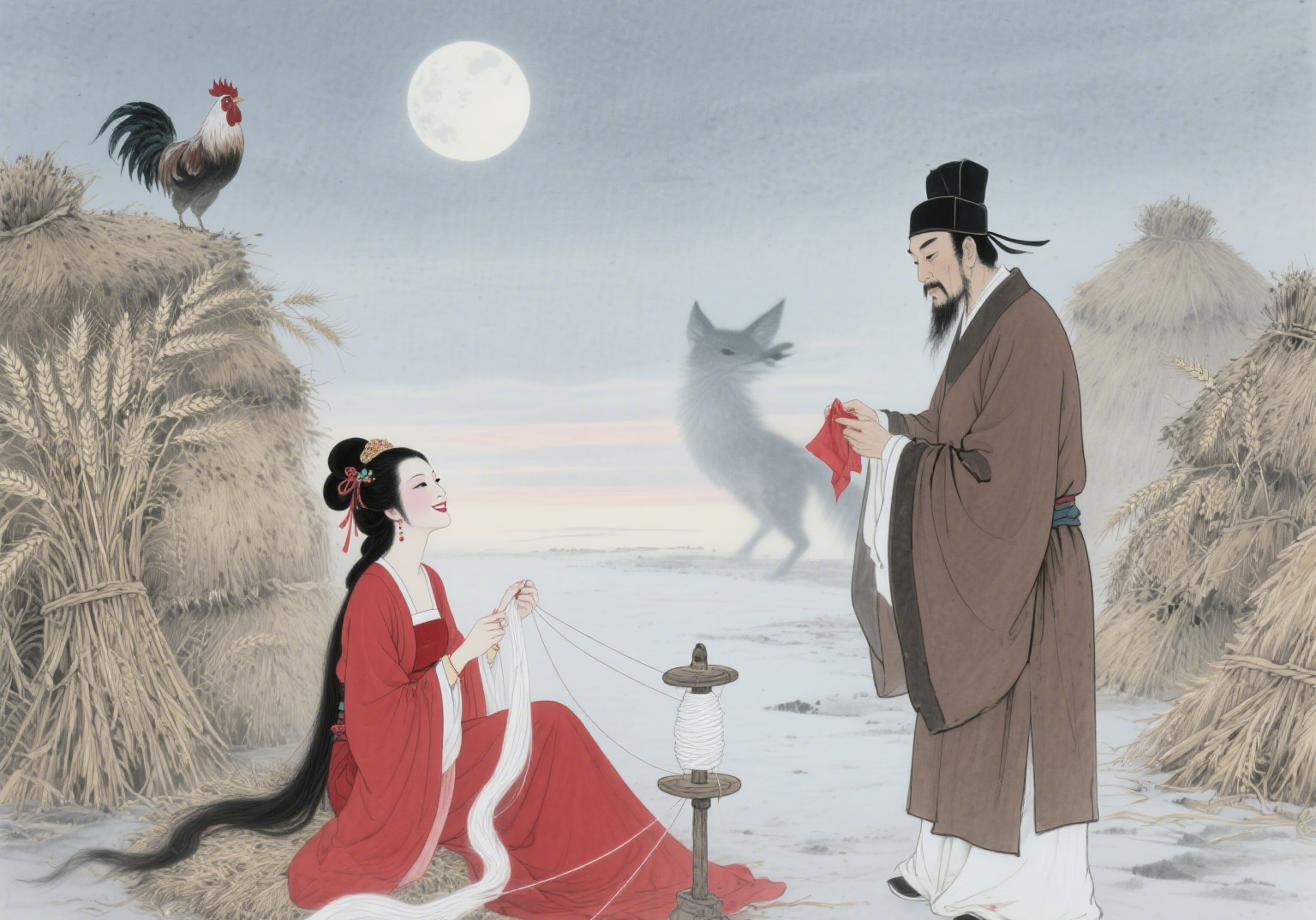 渭水河畔突现红衣女子,姬昌卜卦得"大凶"之兆。当夜他掀开新娘盖头,竟发现新娘手腕缠着三年前自己射中的狐狸金铃…… 一、渭水河畔的诡新娘 西岐的麦浪黄了,姬昌带着猎户巡狩岐山。 忽见渭水漂来一顶花轿,红衣新娘掀帘轻笑:"侯爷,可记得三年前那只断尾狐?" 话音未落,狂风卷着黄土迷了众人眼,轿子竟化作纸灰飘散。 老猎户铁柱"噗通"跪地:"是狐仙讨债来了!去年挖出狐妖骨的张三家,满门都长出了狐狸毛!" 姬昌摩挲着卦筒里的蓍草,发现其中混着一根泛红的狐毛。 二、金铃铛里的秘密 当夜西伯侯府张灯结彩,朝歌送来和亲的苏妲己。 交杯酒时,姬昌突然抓住新娘手腕:"这鎏金铃铛,怎与我射狐箭上的铭文一样?" 新娘眼底闪过绿光:"侯爷好记性,那箭可疼了奴家三百年。" 突然侍卫来报:粮仓起火! 姬昌冲出去时,看见火焰里窜出九条尾巴的影子。 回头再寻新娘,只见婚床上蜷着只雪狐,正舔着前爪的箭疤。 三、麦垛下的真相 姬昌追到打谷场,苏妲己正在月光下纺线。 纺锤上缠的竟是白发,分明是西岐百姓的寿数! 她轻笑:"纣王要我收百魂炼丹,可妾身偏想跟侯爷玩个游戏。" 忽闻鸡鸣破晓,狐影消散处留下一方血帕。 姬昌展开一看,正是当年自己为救百姓,亲手将狐妖幼崽献祭给商巫的契约…… 老槐树精说:这故事在岐山流传了三千年。 有人说姬昌最终烧了契约,放狐妖归山。 也有人说苏妲己扯断八条尾巴,把西岐灾祸转给了朝歌。 唯有那金铃铛年年麦熟时还会响,提醒世人: 冤冤相报时,先看看自己手上沾没沾血。(民间传说,纯属虚构!狐影岐山:西伯侯夜遇九尾妖妃的奇案)