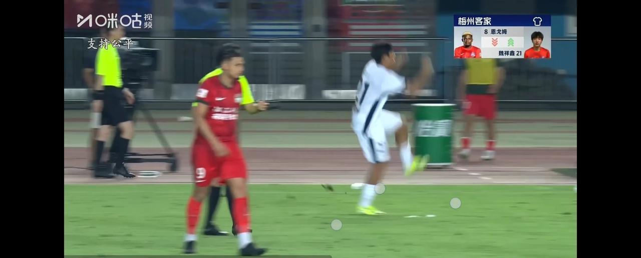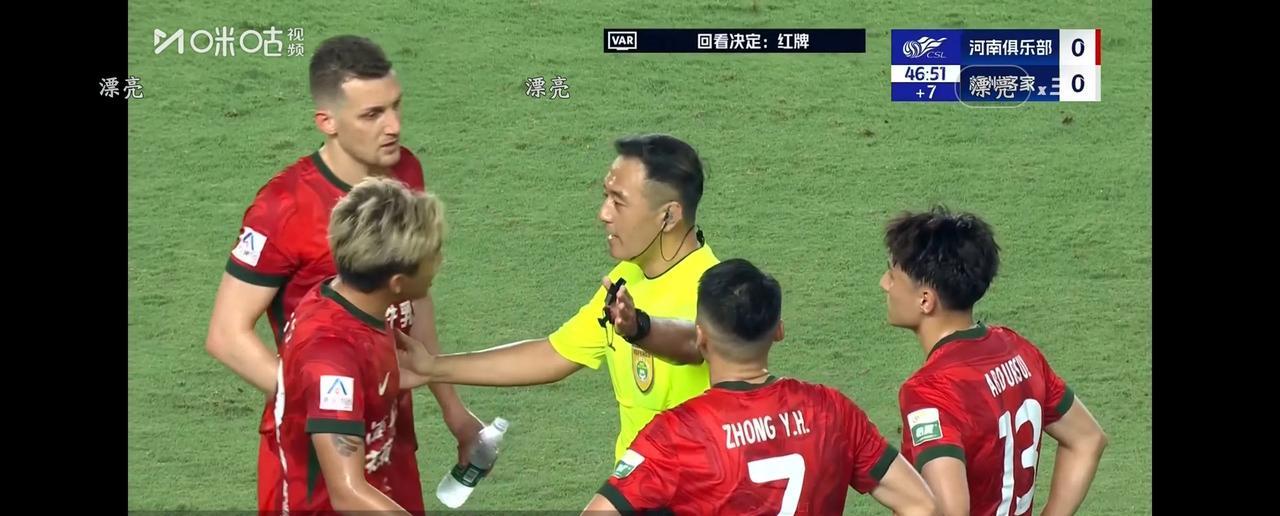 河南队黄锐锋蹬踏梅州客家当家射手恩戈姆,当值主裁判在观看VAR后,直接出示红牌,