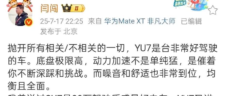 闫闯:YU7是一辆非常好开的车。 闫闯算是把流量玩得明明白白的了。 如今,媒体圈大概有一个共识:夸小米能带来流量,骂小米更能带来流量。 前几他,闫闯吐槽SU7 Ultra的大鼻孔,说它的装饰属性大于实用性,这引发了很大的争议。现在他又开始夸YU7了,他说YU7的行驶质感、静谧性都很好,整体各方面都很均衡。 没流量的时候就去找小米,大V都已经现身说法了,想做自媒体的朋友学会了吗?